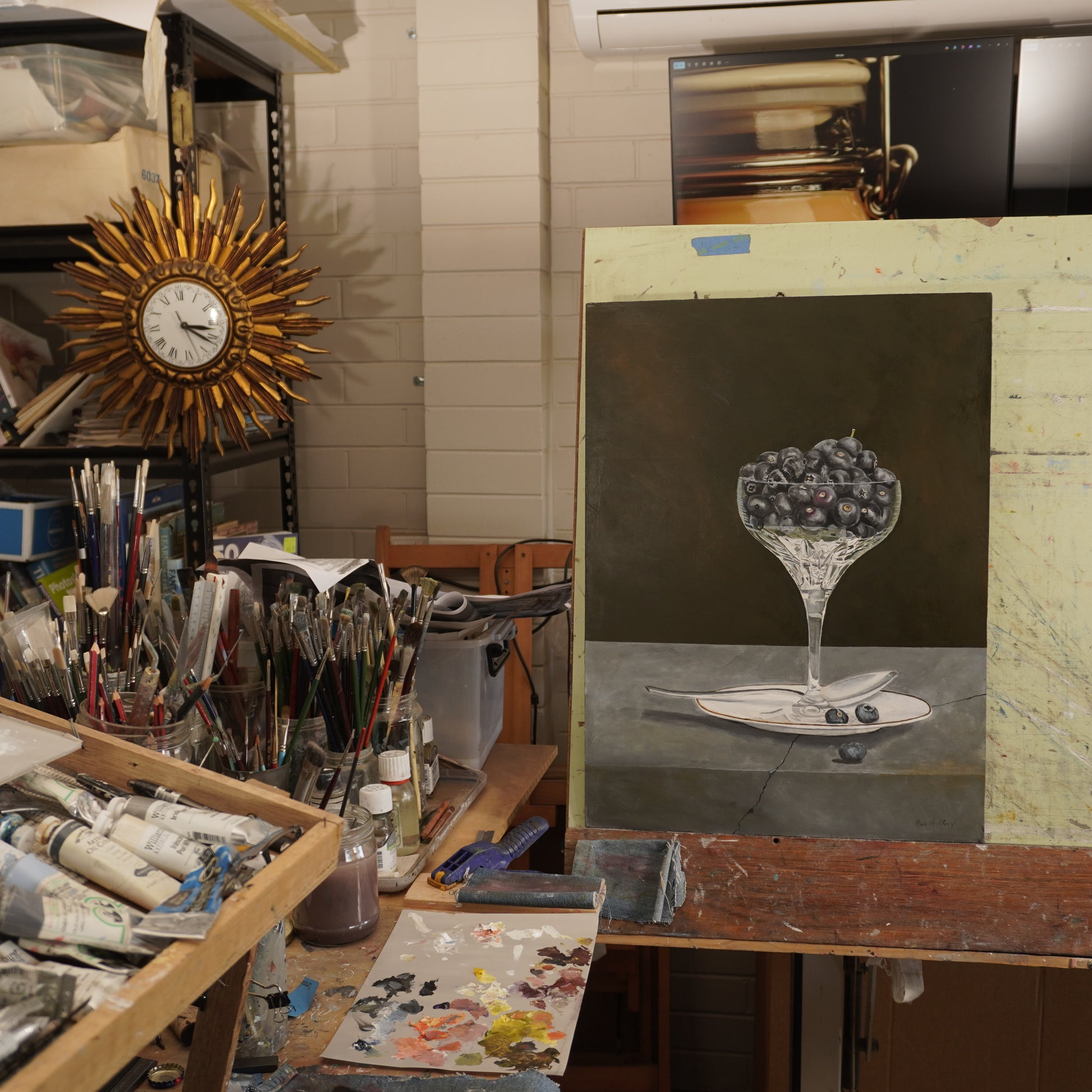 I wanted to paint something sitting in the glass that was going to compliment the crystal champagne glass, and blueberries fit the brief. The colours might be considered subdued but they make the viewer focus on the subject and in this case, not what's around it.
