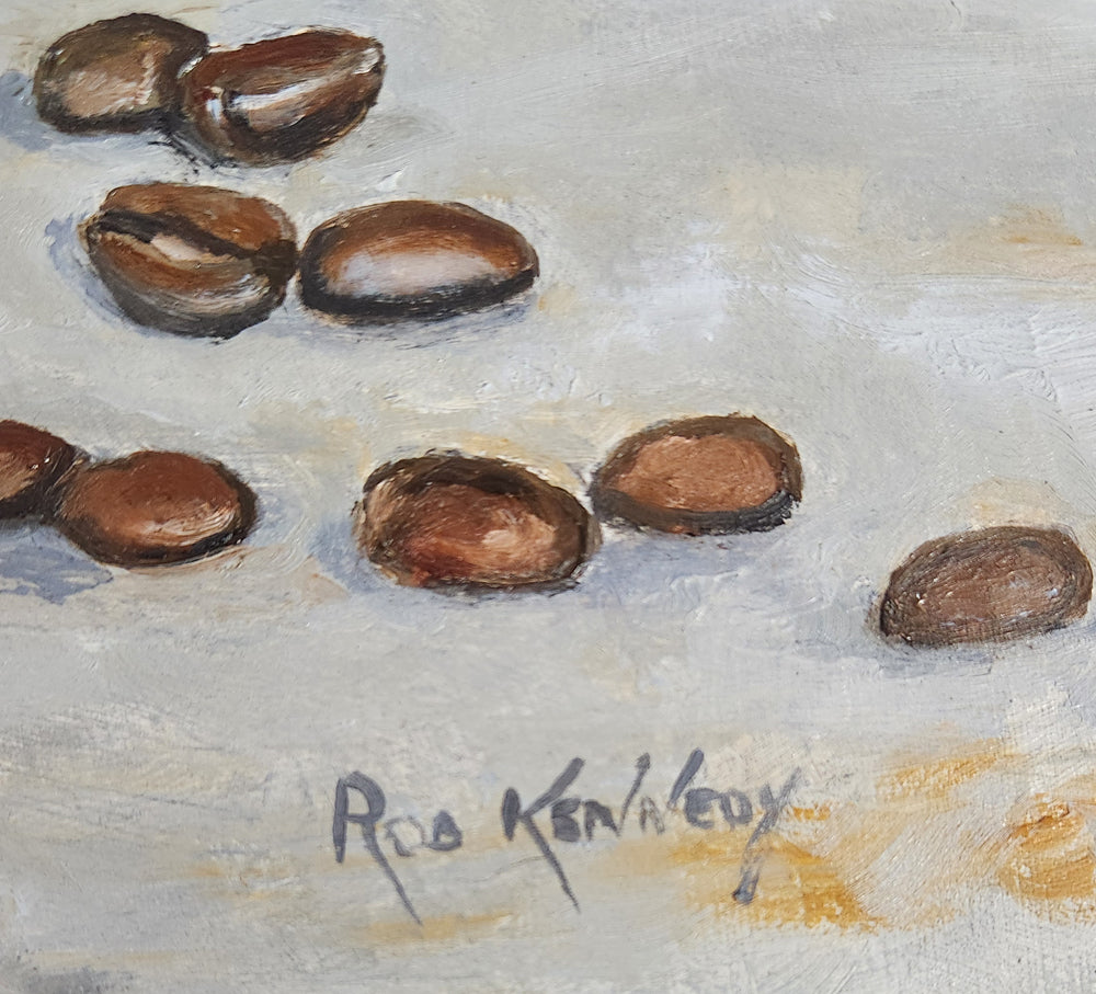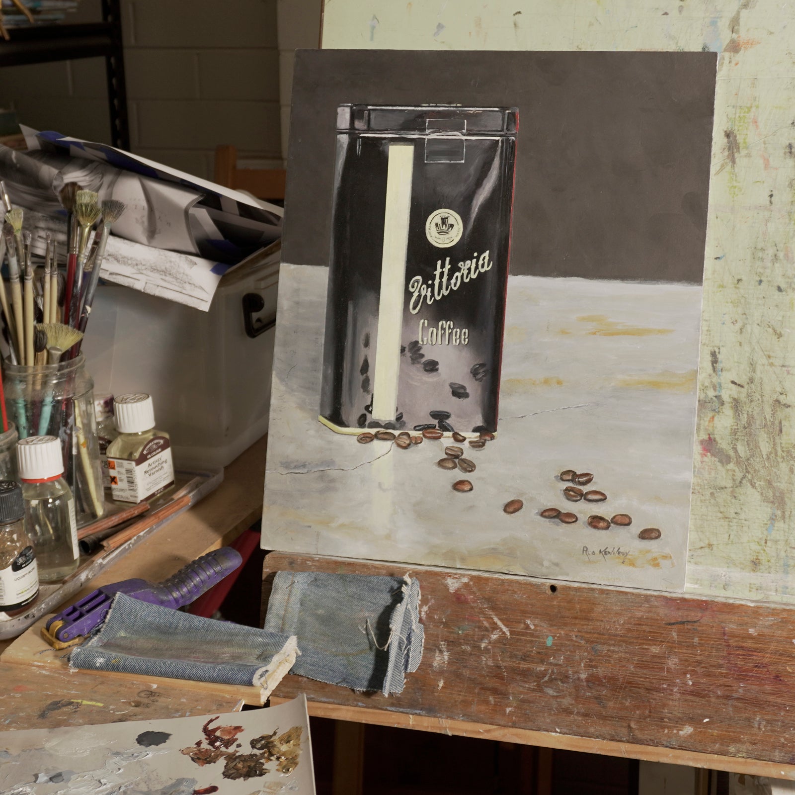 I enjoy perfecting technique and for this I choose a subject that's close to me... basically I paint my own reality, but not something I would paint regularly. The coffee can is smooth and reflective with a printed brand, the concrete benchtop with cracks. To me they represent an artistic and compositional challenge.