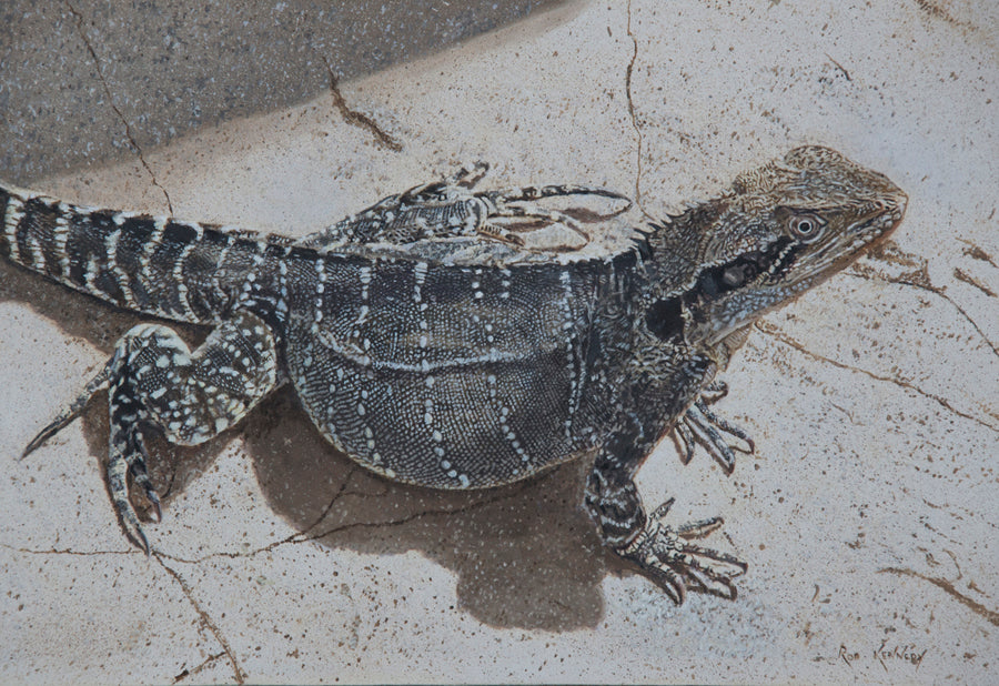 Godzirra is actually an Eastern Water Dragon. When I was staying at Coffs Harbour these guys would hang around the pool and occasionally scare the daylights out of guests. They can be seen at the hotel climbing up on the deck chairs and on to sleeping guests. One Englishman was unlucky enough to let out a blood curdling scream when one touched him, much to the amusement of other guests. This was followed by "That wasn't at all amusing guv" Anyway, that's where I got the title for the painting. Going through my photos of the short holiday I saw how beautiful these dragons are and decided I had to paint one.