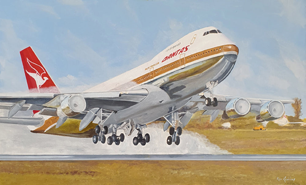 A Qantas 747-200 lifts off from a wet runway creating a cloud of vapour behind it. The engine intakes fog up with the humidity. I probably enjoy these wet humid take offs because of what's going on. The wings create sheets of vapour, engines fog up and clouds of water form in the hot exhaust from the engines.