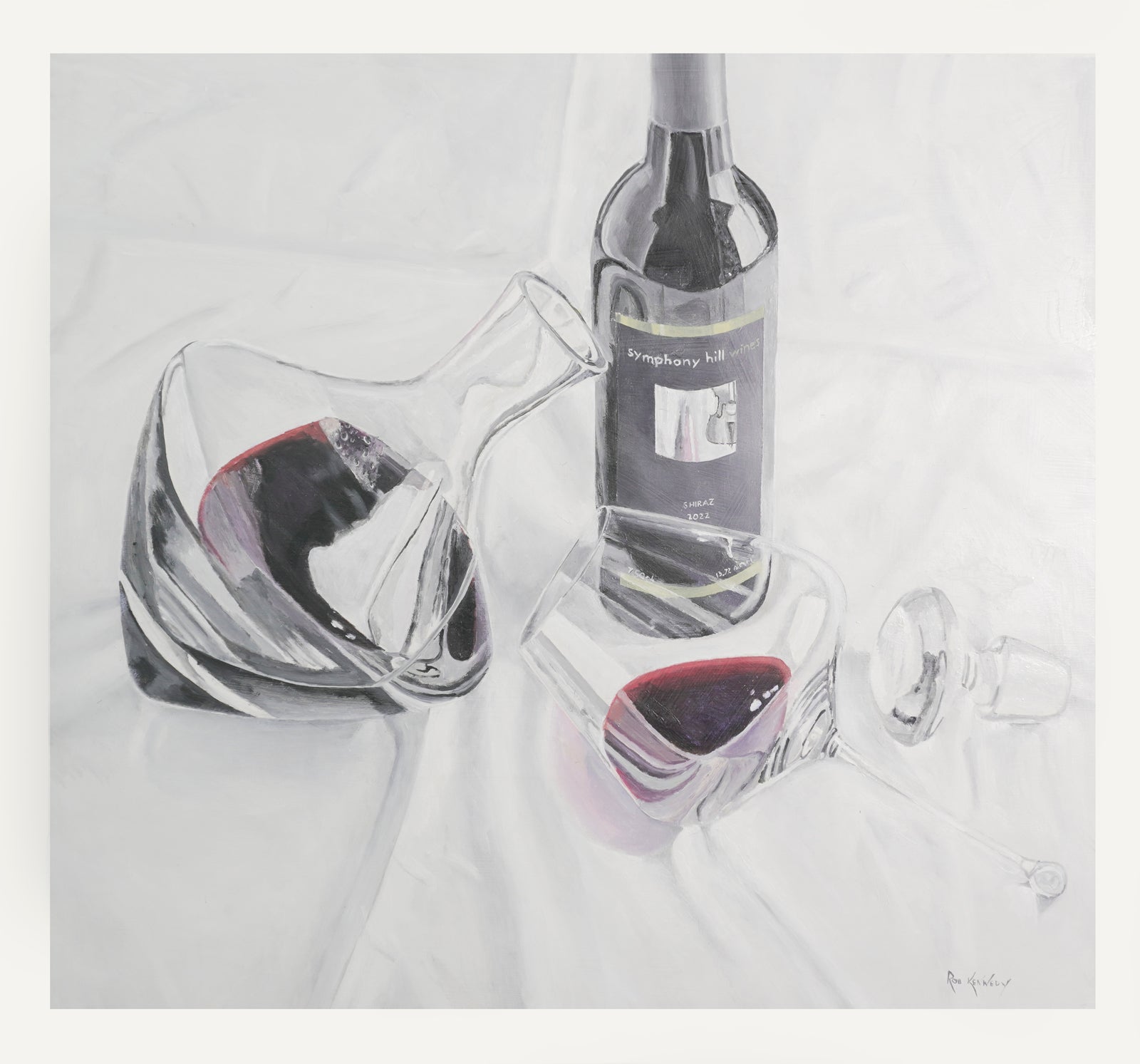 I consider the tablecloth to be its own artwork, somewhat like a snowy landscape. Some of the other detail just sets off what might appear to be an almost monotone painting. There is wine condensation in the neck of the decanter. The eggshell thin Gravitas glass is wonderfully difficult to paint because the reflections create more to see.